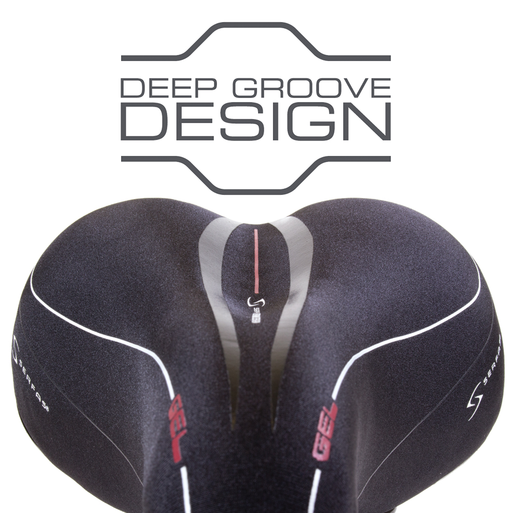 Features Serfas Deep Groove® Design, four-way stretch moisture-wicking Lycra cover, rear spring suspension, and Progressive Foam Technology.