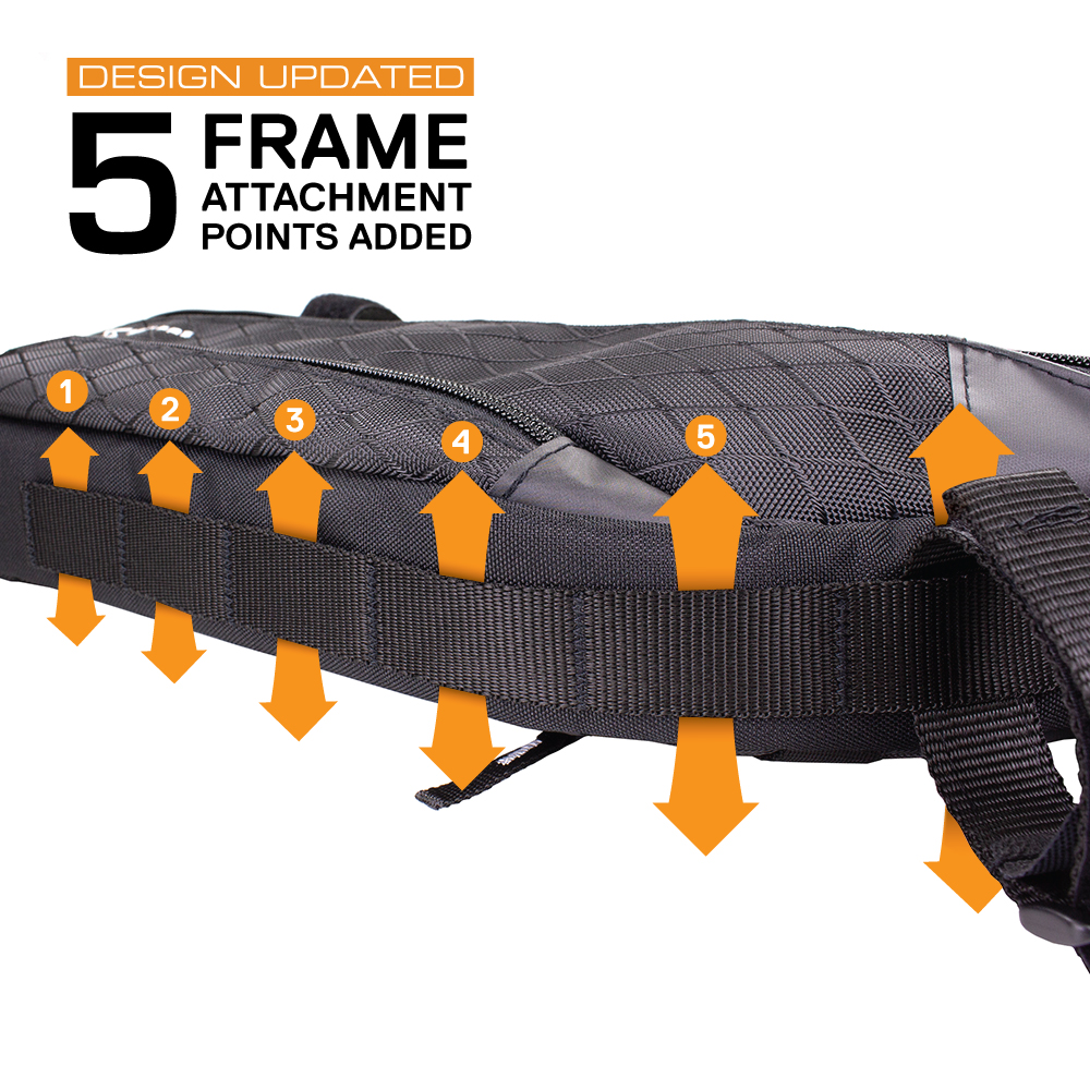 Design Updated (2020) – We listened! We added 5 additional frame attachment points along the bottom of the bag for a more customizable and secure fit to even better accommodate varying frame shapes and sizes.