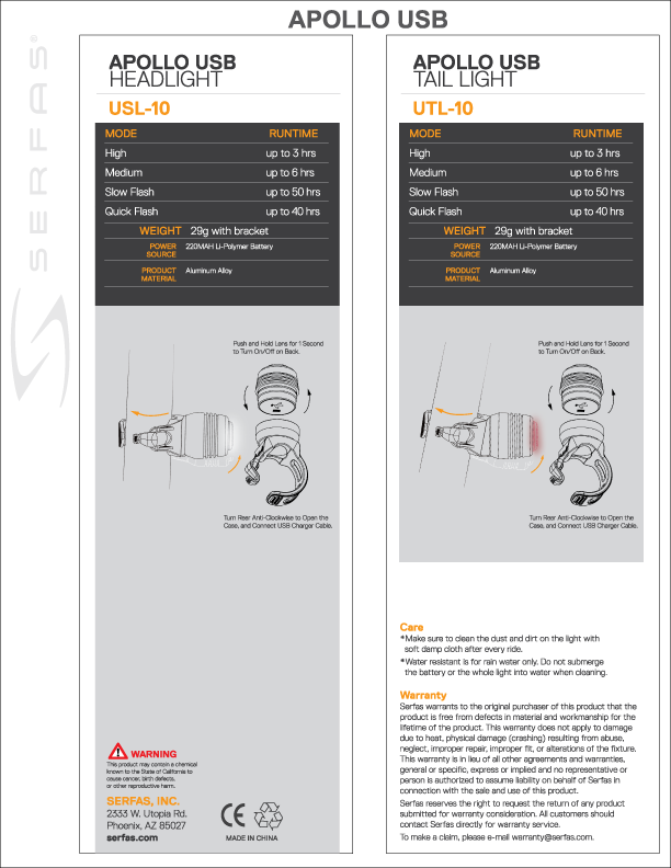 The Serfas® Apollo series is a super compact and surprisingly bright rechargeable waterproof LED light that is quick and easy to mount. Lots of light in a tiny package, plus it fits in your pocket.