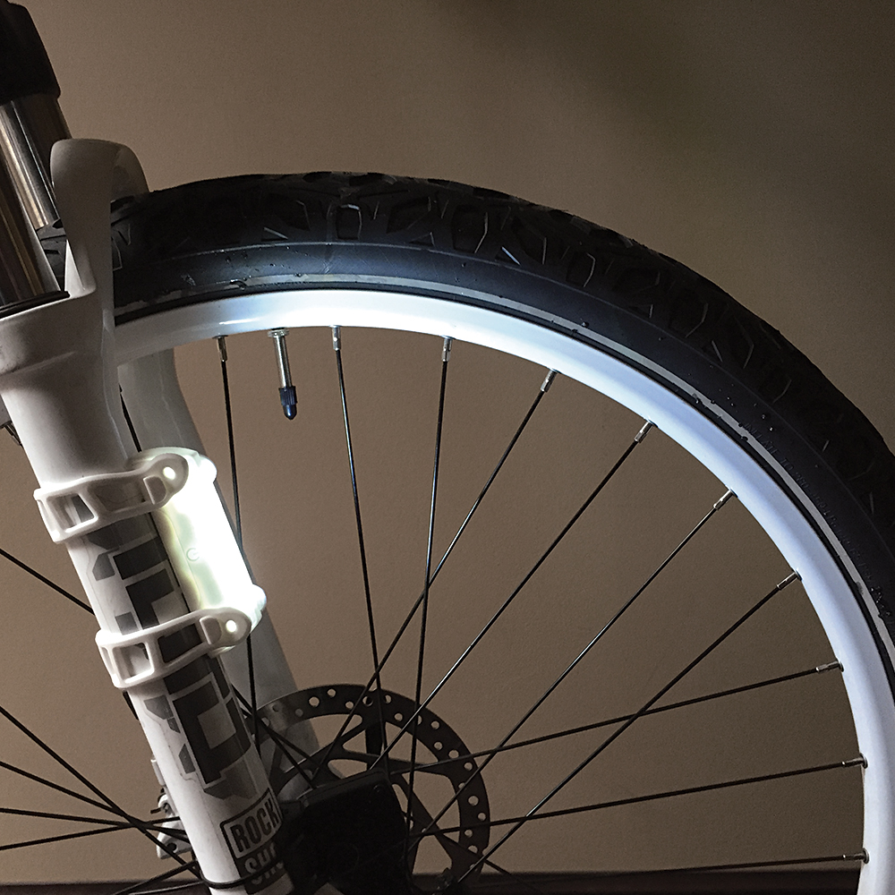 I put various colour gels from a Rosco cinegel sample book and mount these on my top tube pointing straight down to light around me in purple or green so people can see my legs moving around as well as it looking cool as heck! Currently set up with a purple down/under light. I also use 2 to light up the ground (45 degree downward) beside my trailer (in orange) getting that extra visibility going on.