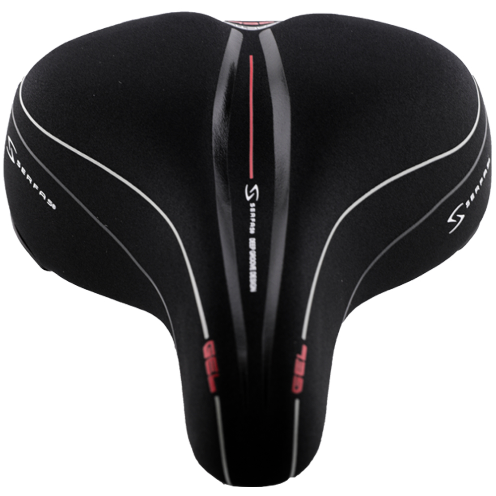 Features Serfas Deep Groove® Design, four-way stretch moisture-wicking Lycra cover, rear spring suspension, and Progressive Foam Technology.