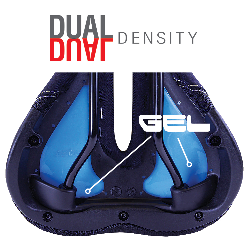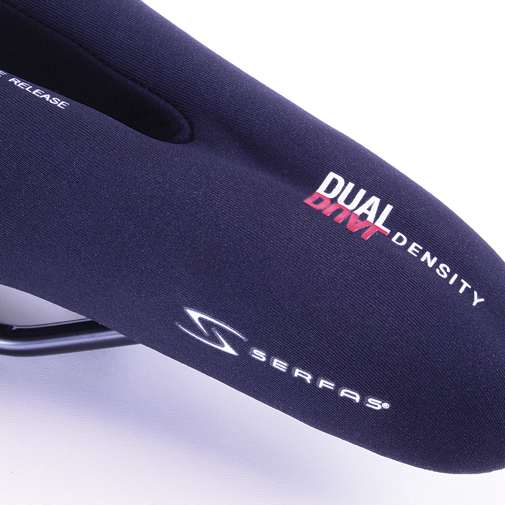The Serfas® Dual Density® line of saddles is constructed using our patented I.C.S. (Infinite Comfort System) technology. Made up of a soft flexible rubber base followed by two layers of soft and firm closed cell foam, and a final top layer of friction reducing Reactive Gel® covered in moisture-wicking four-way stretch Silk-Tech Lycra.