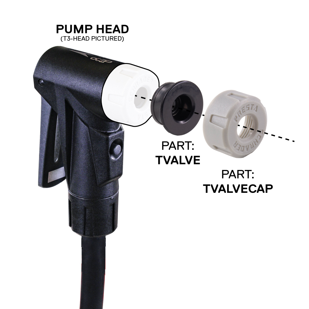 Installation: Insert smaller plug end of replacement TVALVE into head nozzle, flange side out and flush with end of threaded nozzle. Grasp TVALVECAP body with thumb and forefinger and rotate clockwise back onto pump head.