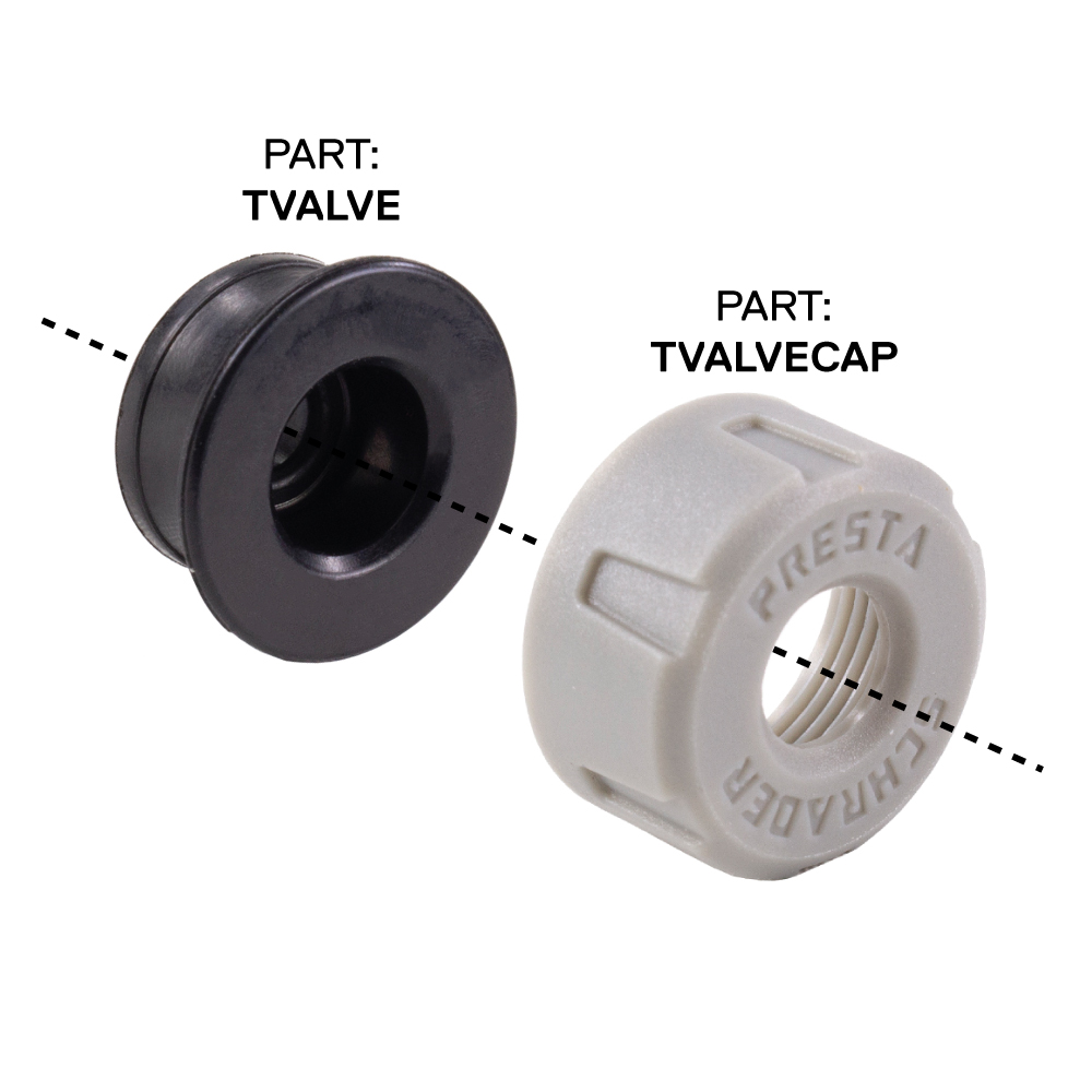 Removal: Grasp TVALVECAP body (gray cap marked PRESTA and SCHRADER) with thumb and forefinger. Rotate counterclockwise until separated from threaded head nozzle. TVALVE is located between the cap and head. Upon disassembly TVALVE may be found loosely seated within the removed TVALVECAP or on the threaded head nozzle.